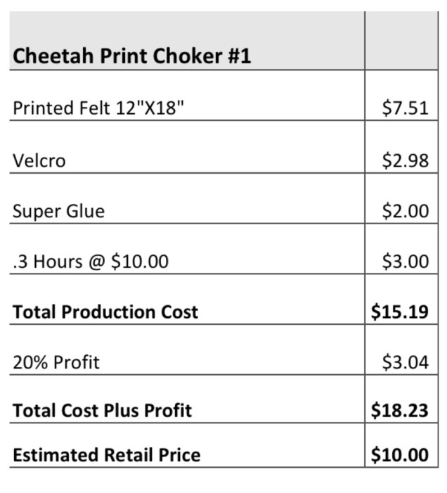 I added the cost of all of the materials I bought the make this choker necklace. I Multiplied the time it took to make the necklace by how much I would be paid if I worked at a retail shop then added it all together to get the Production Cost.
