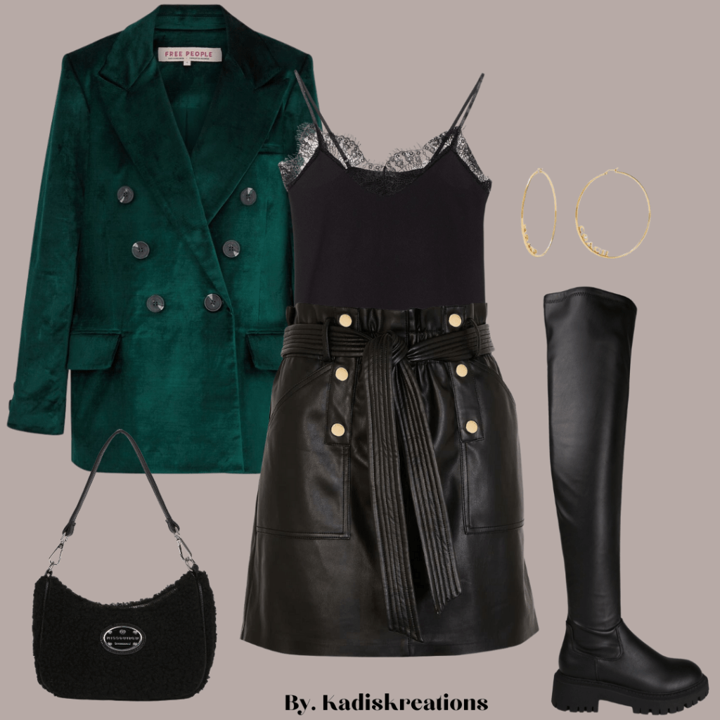 I feel that this outfit would be great for Thanksgiving! This look gives off the perfect holiday vibe. To start off, I picked a green velvet blazer that reminded me of the fall and winter seasons. Next, I wanted to find a skirt that was a different texture than the blazer. So, I picked a faux leather skirt with a belt and gold buttons that complemented the blazer well. For the shirt, I picked a black lace-trimmed camisole. I originally wanted it to be velvet like the blazer but, this one matches just as great. Then, I choose the accessories. For the purse, I decided to play around with textures again. So, I picked a bag with a teddy bear-like material. For the shoes, I found faux leather over the knee boots. These boots match perfectly with the mini skirt since they are both made of the same material. Lastly, I choose hoop earrings from Coach. I have wanted these earrings for a while so, I thought I would add them to this look!
