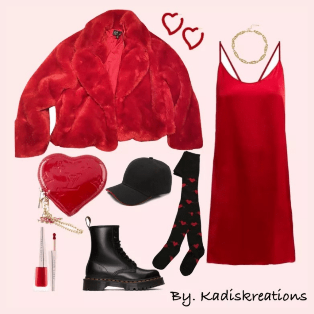 First, I choose a similar red faux fur coat from Zara that matches great with the red silk satin dress. Next, I added the iconic red heart-shaped coin purse from Louis Vuitton with heart-shaped earrings and a gold necklace to match. Then, I choose knee-high socks with a heart pattern, a black cap with a red brim, and black Dr. Marten platform boots. Lastly, I added Fenty Beauty’s Stunna Lip Paint which is perfectly on-brand for this Rihanna-inspired look.